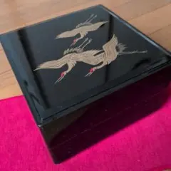 黒地に金色の鶴が描かれた重箱、赤い内側と中央の模様が特徴。