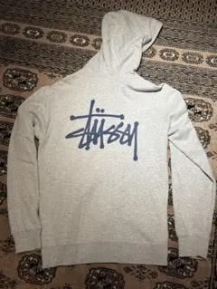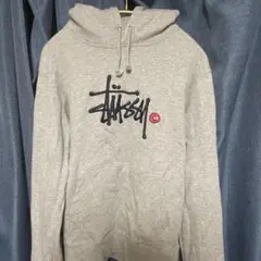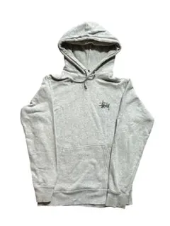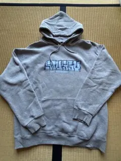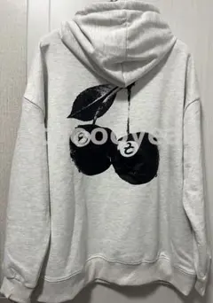 グレーのフーディー、刺繍ロゴ付き、カジュアルスタイルに最適。