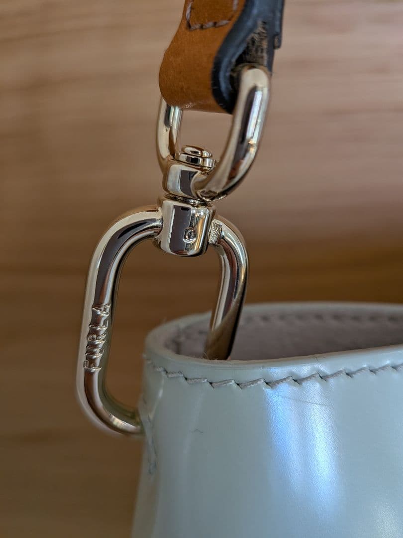 ミントグリーンのレザーショルダーバッグ、金具式留め具付き。
