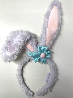 ふわふわのウサギ耳カチューシャ、青いリボン付きで可愛いデザイン。