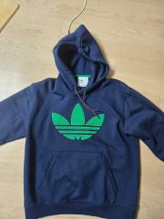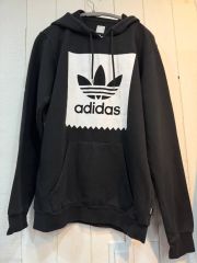デサント社製アディダス3STRIPESタグの日本製の袖口にトレフォイルの刺繍ロゴ入り、両ポケ付きハーフジップパーカースウェットです。