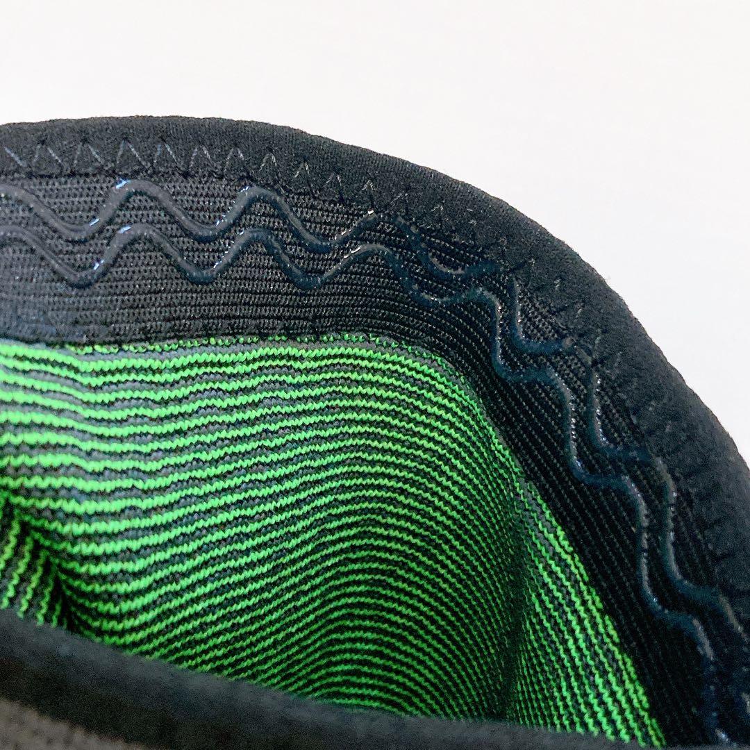 ストレッチ素材でフィット感のある足用サポーター、グレーとグリーンのデザイン。