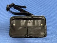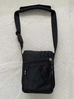 ネイビーのナイロン製ショルダーバッグ、ジッパー付きポケットあり。