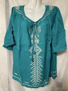 花柄デザインの五分袖チュニック、ラウンドネックでファスナー付き。