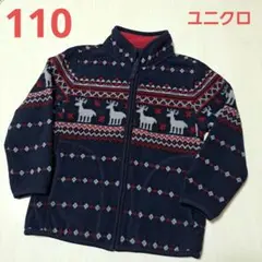 ネイビーのフリースジャケット、フェアアイル柄デザインで温かく、全開ファスナー付き。