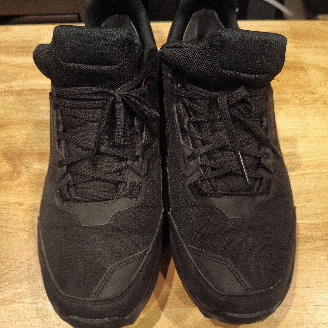 アウトドア向けのブラックハイカットスニーカー、耐久性のある合成繊維製。