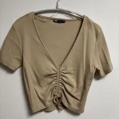 リブ編みのイエローTシャツ、サイドギャザー付き。