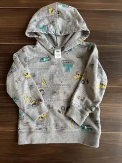 フリース素材の切り替えデザインで、袖にメッセージプリントが施された90cmサイズのグレーのトレーナーです。