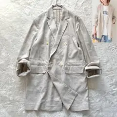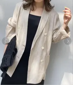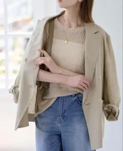 ダブルボタンのベージュテーラードジャケット、前面に2つのポケット付き。