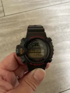 デジタル表示のG-SHOCK、ブラックラバー製バンド、金属バックル付き。