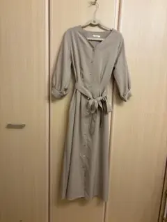 ハニーズのオリーブグリーンのシャツワンピース、七分袖、ボタン付き、ウエストリボンデザイン。