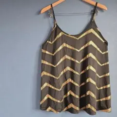 ネイビーのキャミソール、レース装飾付きVネックデザイン。