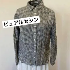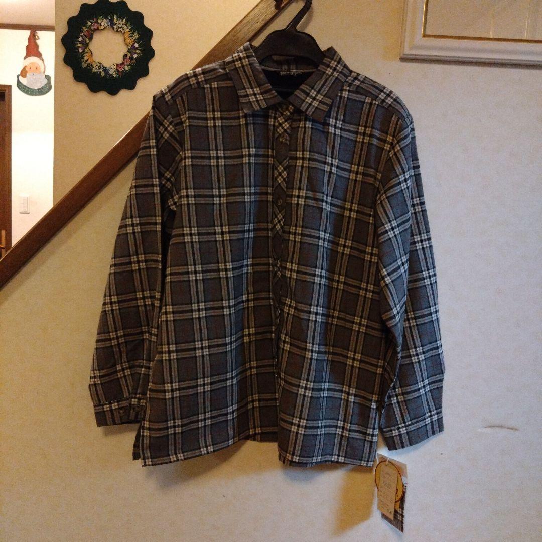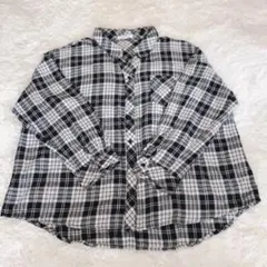 グレー系のチェック柄の長袖シャツ、ボタン付きの襟とカフスが特徴。