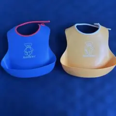 シリコン製でお手入れ簡単なBABYBJÖRNのお食事エプロン、イエローとブルーの2色セット。
