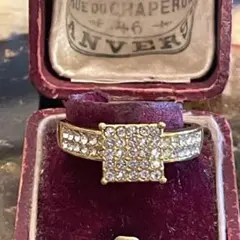 金属部分は素材不明。刻印無し。石はラインストーン。日本サイズで14号です。