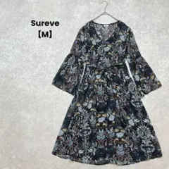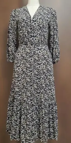 花柄 モノトーン花柄ワンピース 七分袖 Vネック 上品 大人 L 11号