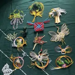 伝統的な水引の装飾品セット、様々なデザインと色合い。