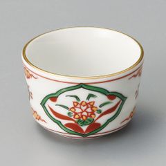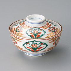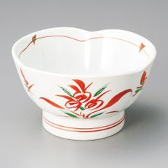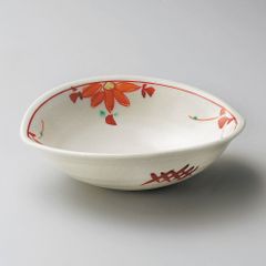 白磁に鮮やかな赤絵の草花と、内底の深みのある青い牡丹文が対比となって、非常に華やかなデザインです。煮物鉢やサラダボウル、菓子鉢など、多用途にお使いいただけるサイズ感です。