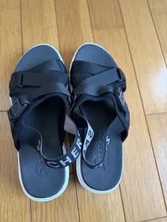 アーチサポート付きのブラックサンダル、快適な履き心地。