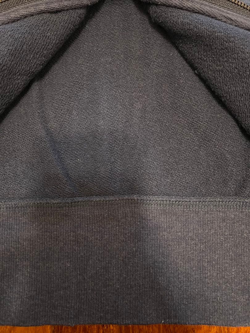 ネイビーのフルジップフード付きパーカー、アイボリーの紐付き、フロントポケットあり。