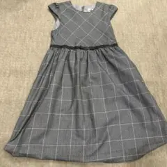 ネイビーのチェック柄ノースリーブワンピース、ボタン付きで小さな刺繍ロゴあり。