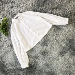 青のストライプにレース装飾が施された長袖クロップドシャツ。
