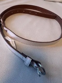 ピンクの合成皮革製の細身ベルト、ブラウンの金属バックル付き。