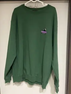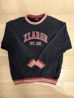 グレーのXLARGEトレーナー、1991年デザインの刺繍ロゴ付き。