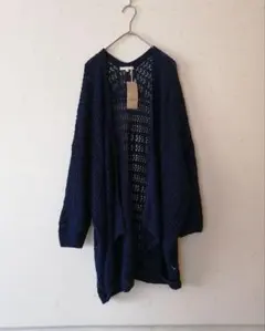 フード付きのベージュロングカーディガン、ウエストリボンでスタイル調整可能。