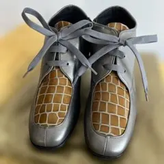 とても柔らかい皮にスエードの切り返しで、布を重ねて立体的に見せた甲のベルトに、アーガイルをモチーフとしたスパンコールの飾りが付いた、とても大人な雰囲気のショートブーツです。