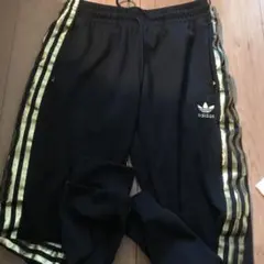 グレーのadidasジョガーパンツ、サイドに3本ラインデザイン。
