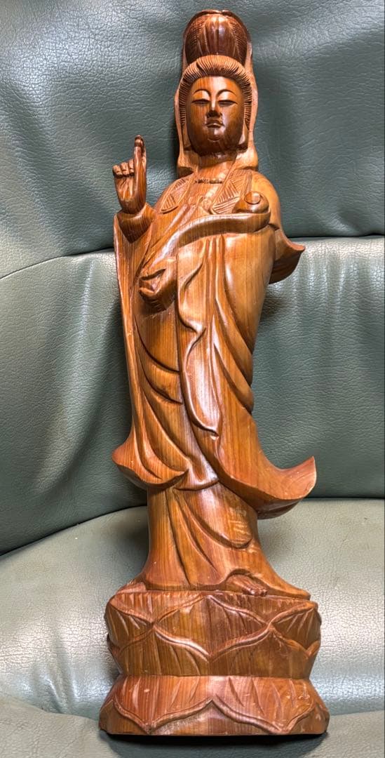 木製の観音像で、穏やかな表情と装飾的な台座が特徴。
