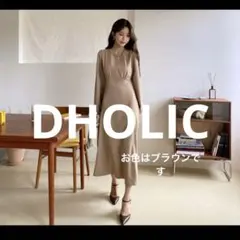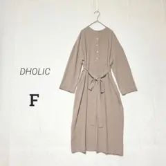ベージュの長袖ロングワンピース、ウエストリボン付きでカジュアルなデイリースタイルに最適。