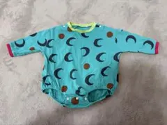 青と白のストライプと赤のパイル生地の異素材デザインのロンパース。