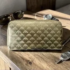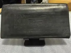 エンボス加工のブラックレザー長財布、付属箱付き。