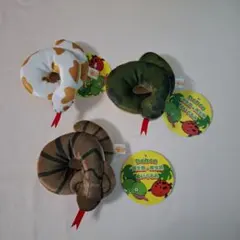 茶色の蛇の可愛いぬいぐるみ、緑のストラップ付きで持ち運び便利。