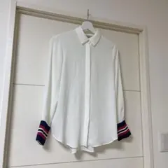 フリルデザインのホワイト長袖シャツ。