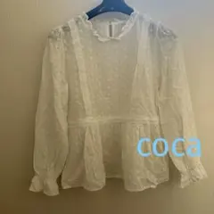 オフショルダーのブラウンシャツ、ポリエステル98%素材で快適な着心地。