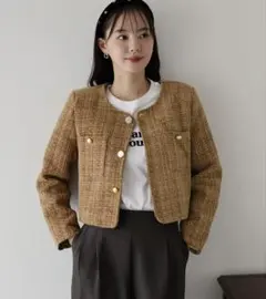 フリンジ仕上げのツイードノーカラージャケット