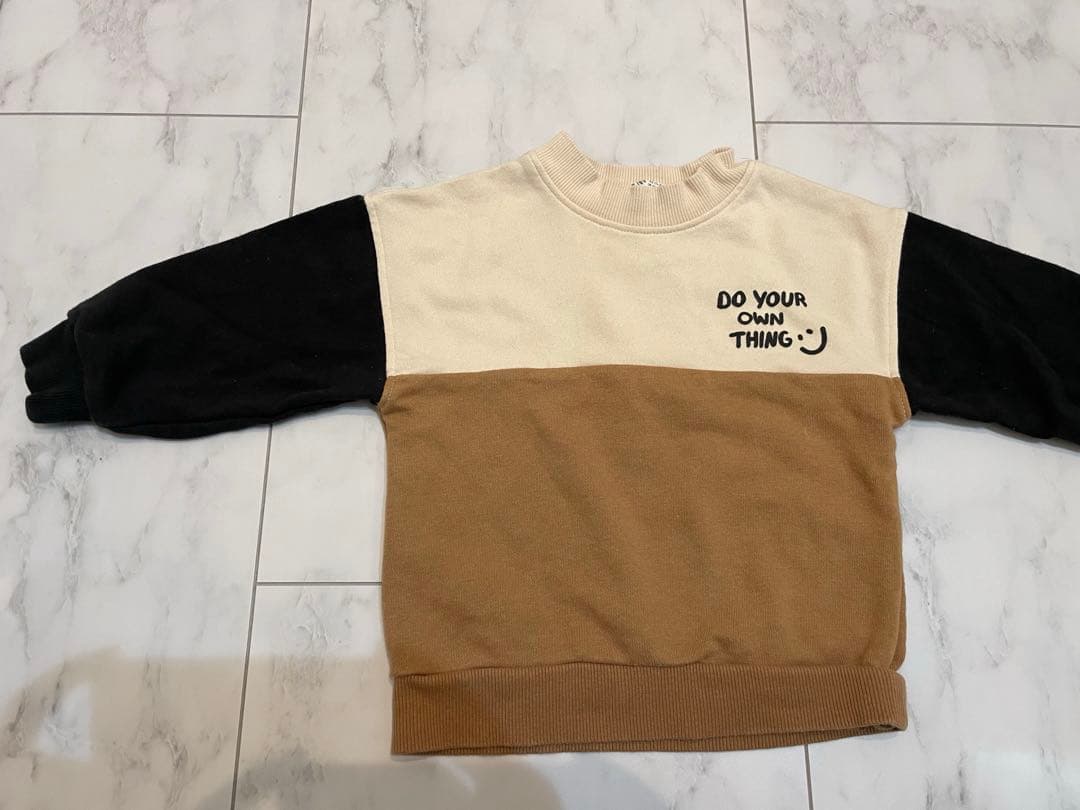 カラーブロックデザインの長袖トレーナー、メッセージプリント付き。