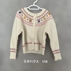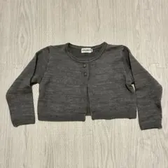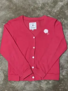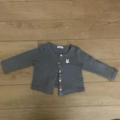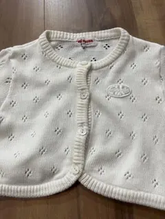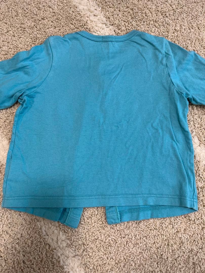水色の長袖カーディガン、ライオンの刺繍付き、カラフルなボタンが特徴。