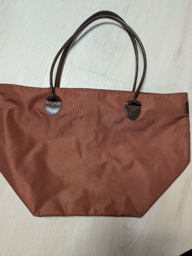 ブラウンショルダーバッグ、レザー調ハンドル付き。