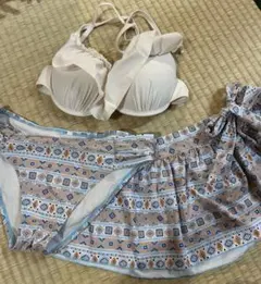 フラワープリントのセパレート水着、ホワイトとマルチカラーの組み合わせ。
