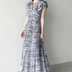 フリル付きの襟が特徴的なノースリーブのマーメイドシルエットワンピース。