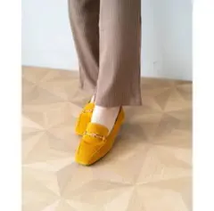 ネイビーのスエード素材にゴールドのアクセントが特徴のローファー。