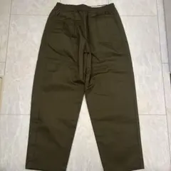 イージーパンツのようなゴム仕様のウエストと2本のタックにより腰回りはボリュームがあり、裾に向かってスッキリとテーパードさせたシルエット。