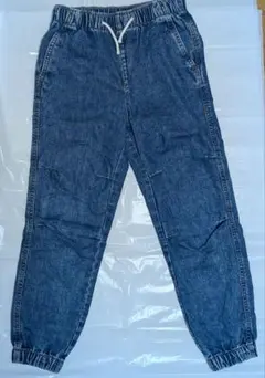 ダークブルーのジョガーパンツ、バックポケット付き。