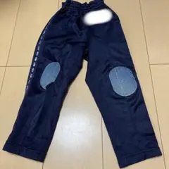 男児が着ていたので、補強のため膝の裏側に当て布をしています。着用すれば、外側からはそれほど分からないと思います。活発なお子さんは膝部分を破いたり、穴を開けるので、そのままの方が良いと思いますが、ご希望なら剥すのでコメント下さい。アイロンでつけているので、剥がし跡が少し残るかもしれません。