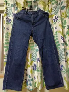 ダークブルーのストレートデニムパンツ、バックポケット付きで実用的。