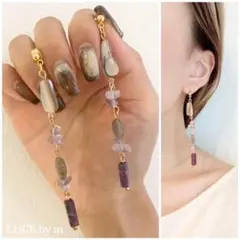 グリーンアメジストとピンクアメジストのアシメトリーピアス。